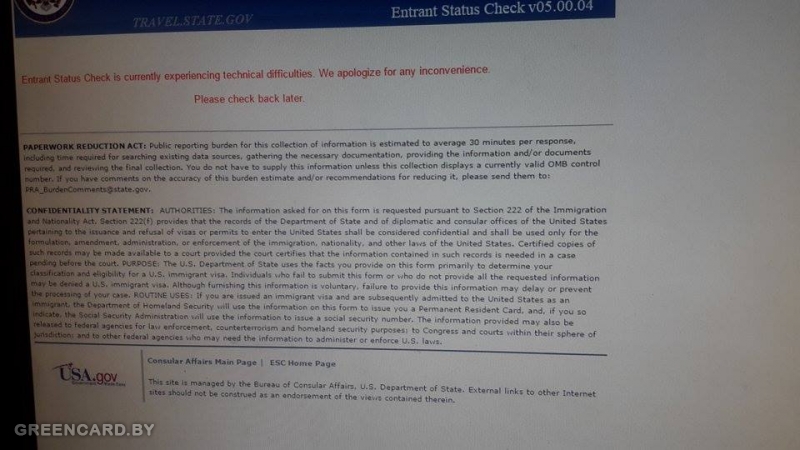 Внимание! Все, кто проверил результаты розыгрыша лотереи DV-2016 и получил сообщение о том, что заявка не выиграла — обязательно позже проверьте результат еще раз: на сервере был сбой, такое сообщение выдавалось абсолютно всем. Ссылка.