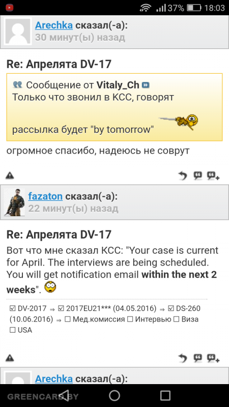 ✓ CN 2017EU000013** ✓ DS-260 (10.10.16) ✓ Приглашение (03.03.17) ✓ Медосмотр (21.03.17) ✓ Интервью (04.04.17) ✓ Визы (05.04.17) >> в США с 07.09.2017 ✓ Гринкарта (14.10.17)