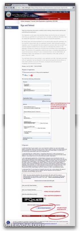 Отличие электронных анкет DS-260 от бумажных DS-230 и DSP122 в том, что от руки в них ничего не вносится. Электронная подпись подразумевает, что вы вводите еще раз номер паспорта того, на кого заполнена данная анкета. Поэтому, разумеется, вы делаете это за своих детей, так же, как вы заполнили анкету. Электронная подпись означает, что вы подтверждаете достоверность и актуальность предоставленной в анкете информации, а не то, что "подписать" должен заполнивший форму.