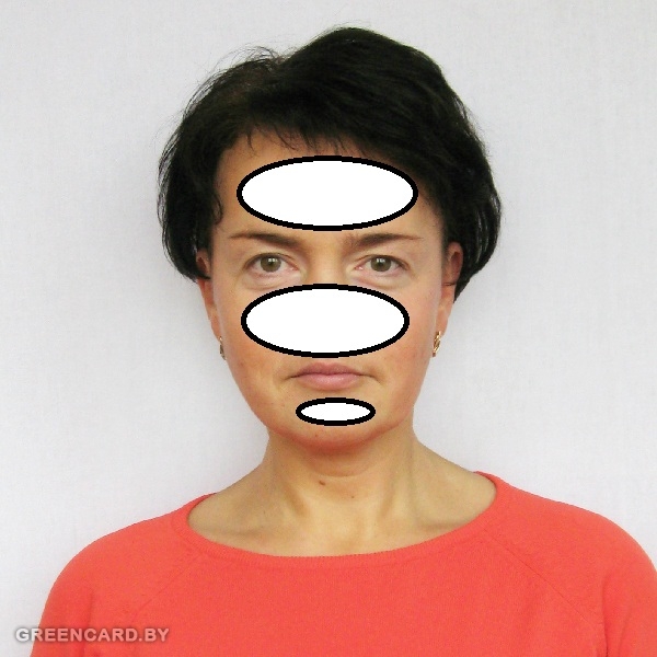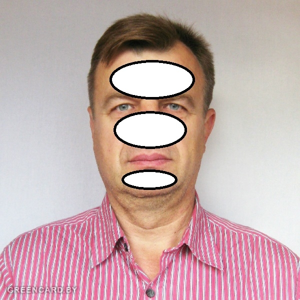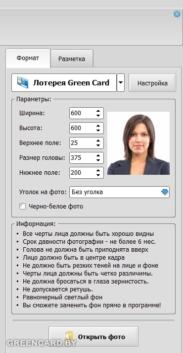 Могу посоветовать из личного опыта. Я нашел программку "Фото на документы". С ее помощью все легко и просто. Снимок делал на фоне листа ватмана. Без вспышки, днем. Чтобы не было теней, просто отошел подальше от фона. Вот скриншот программы. Там есть все параметры на грин кард. Она и фото по центру выставит и яркости при необходимости добавит. В общем у меня все получилось.