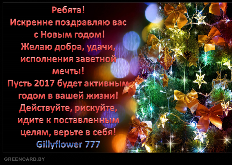 С наступающим Новым годом всех! Пусть удача, здоровье и счастье будут вас сопровождать весь 2017! И веселого незабываемого праздника! И пусть когда-нибудь мы встретим его в стране нашей мечты! С НОВЫМ ГОДОМ, ДРУЗЬЯ!