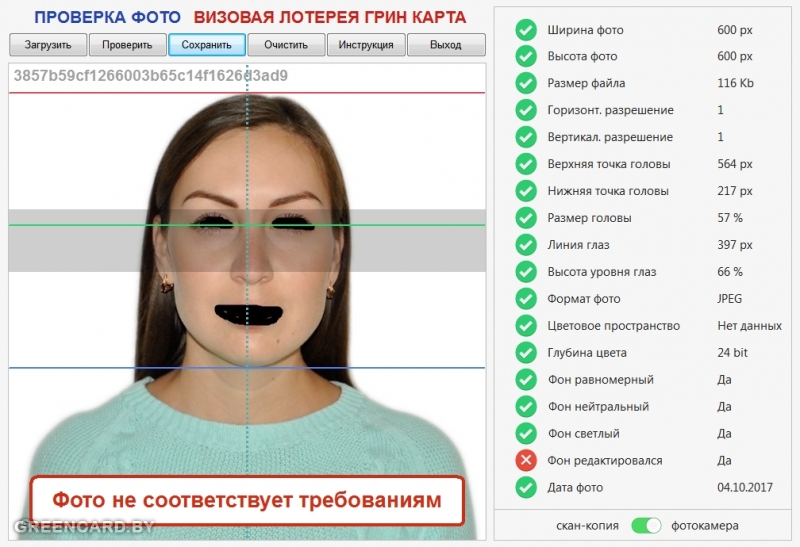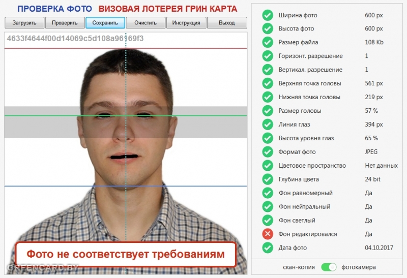 Ваш фотограф поленился выставить баласн белого. В результате последние 2 фото ещё как-то проходят проверку, но первая- уже нет. Это говорит о том, что и последние фото балансируют на грани допустимого. Фотографы в таких случаях просто зачищают фон, вместо того, чтобы выставить правильно баланс белого и перефотографировать - так им проще. Но для грин-карты такой вариант (с зачисткой фона) не годится.