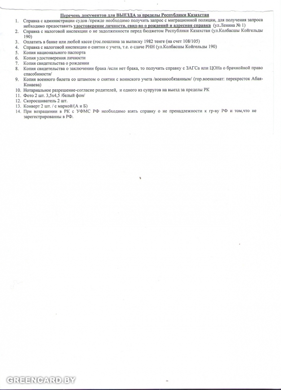 Г. Усть-Каменогорск. Продали квартиру, новые хозяева нас выписали, позвонили нам и предупредили чтобы мы прописались. Пошли прописываться в квартиру родителей. Для прописки необходимо оплатить гос пошлину 198 тг на ИИН каждого прописываемого. ИИНа дочки в базе не оказалось, нас отправили в налоговую регистрировать иин, прописка провалилась. Пришли в налоговую, заполнили некую форму 2. Сказали ждите 3 дня. Через 3 дня оплатили прописались. Готовимся сдавать документы в иммиграционку. Справку в ГАИ об отсутствии штрафов взяли, делается она 3 дня. для справки с налоговой нужно оплатить все задолженности по налогам на ИИН владельца, платеж приходит через 3 дня. Для справки заполняем какие-то формы ставим отметки об отсутствии долга за транспортный налог и налога на недвижимость, потом на восьмом этаже еще кто-то стаыит отметку напонятно о чем. Сказали донести копию договора о продаже квартиры, но когда донес тот же человек сказал что это не надо, потом сказал отдайте родителям, чтоб они потом принесли... Тут мозг отключился и дальше я не слышал какой бред она несла просто сказал хорошо как скажете. Вобщем сдали формы на себя и на дочку справки делаются три дня. В двд нужно поставить отметку об отсутствии оружия. Ее ставят только в среду с 3 до 5 и в субботу с 8 до 12. В итоге сдали в миграционке 2 конверта почтовых формата а5 и 2 скоросшивателя, все документы из списка (попробую выложить фото списка), в том числе паспорта. нам выдали расписку и справку для сдачи военника в цоне. справка о сдаче военника делается один день, потом нужно донести копию справки в миграционку. На следующий день позвонили с военкомата сказали когда будите забирать в цоне справку донесите заверенную копию вызова. Я сказал, что вызова нет есть только виза в паспорте который я сдал в миграционку, и вообще такого требования нигде нет и что достаточно будет справки ДВД с печатью и подписью майора о том что мне нужно сдать военник для выезда. Но на том конце провода мне послышались кудахтанья, решил не спорить сказал что донесу. для себя решил что если дадут паспорт сделать завереную копию то сделаю если нет принесу просто копию. Так же подумал сделать копии завереные письма от консула о том что виза жает право на въезд и пмж и передать ее в военкомат и миграционку. Им чем больще бумаг тем они крепче спят потом наверное. Позвонил в миграционку спросить про паспорт, не берут трубку. Потом вспомнил что в четверг они не работают. Пойду завтра. на счет документов в миграционке сказали звонить через месяц узнавать, получать в другом месте на Ворошилова 1. Дальнейшие инструкции по выписке сказала потом расскажет. В миграционке хорошая приветливая женщина майор, налоговая мерзкое заведение, военкомат тоже странноватый, хорошо хоть туда идти не нужно. Ждите продолжения)