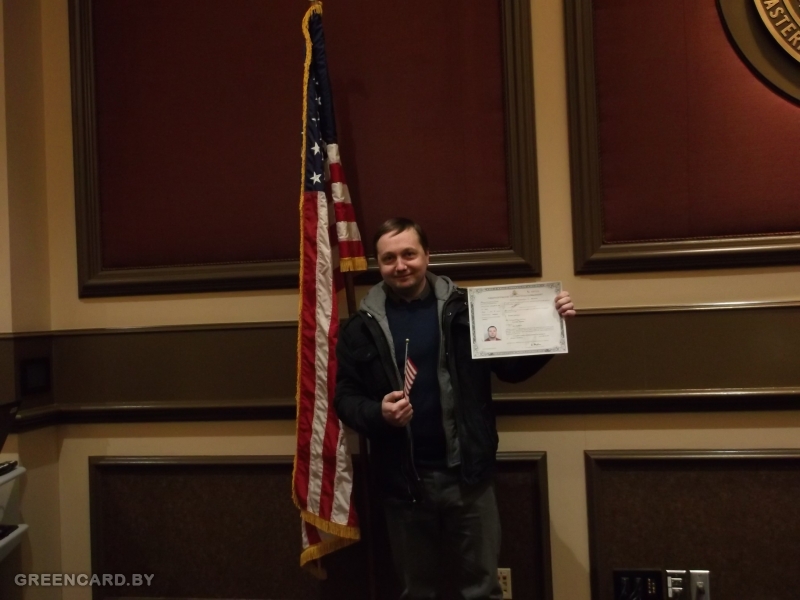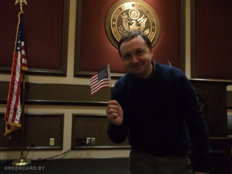 Ну а дальше. Буквально через пару дней пришло письмо с приглашением на интервью на 28 января. И вот сегодня свершилось. Сама церемония проходит в здании суда, всё очень серьёзно. Людей, всевозможных национальностей на натурализацию собралось порядка 30-40 человек, плюс родные и поддержка. Вначале очередь в коридоре. Кстати, не очень понравилось отношение офицеров к ожидающим, как-то грубовато согнали всех под стенку, чтобы поставить ограждения. После этого, женщина офицер пробежалась по всем присутствующим, проверяя документы, и спрашивая правдивые ли ответы в анкете-приглашении. Потом очередь подходила к столу, где нужно было сдать свою старую грин-кард крепенькому мужичку. Взамен он просил поставить роспись на наших сертификатах натурализации и предлагал взять комплект брошюр в бумажном пакете для новых граждан и по маленькому американскому флажку. Дальше все зашли в зал для церемонии. Ждали правда долго, церемония была назначена на 9.30 но началась только где-то через час. Сначала дедушка в судейской мантии поздравил всех. Потом рассказывал о наших новых обязанностях и привилегиях. Потом зачитывание фамилий, и поздравления с вручением сертификата. Также слова клятвы с рукой к сердцу. Всё ждал когда начнём петь гимн, жена говорила что это входит в программу. Но чего-то до гимна так и не дошли )) И в конце напутствующие слова от женщины офицера и снова дедушки судьи. Бурные аплодисменты, и все на выход! Вот такая моя история с гражданством, может кому полезен будет данный опыт, ведь большинство гринкартовцев в итоге становятся гражданами - это следующий этап для нас.