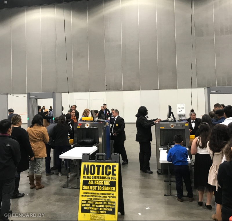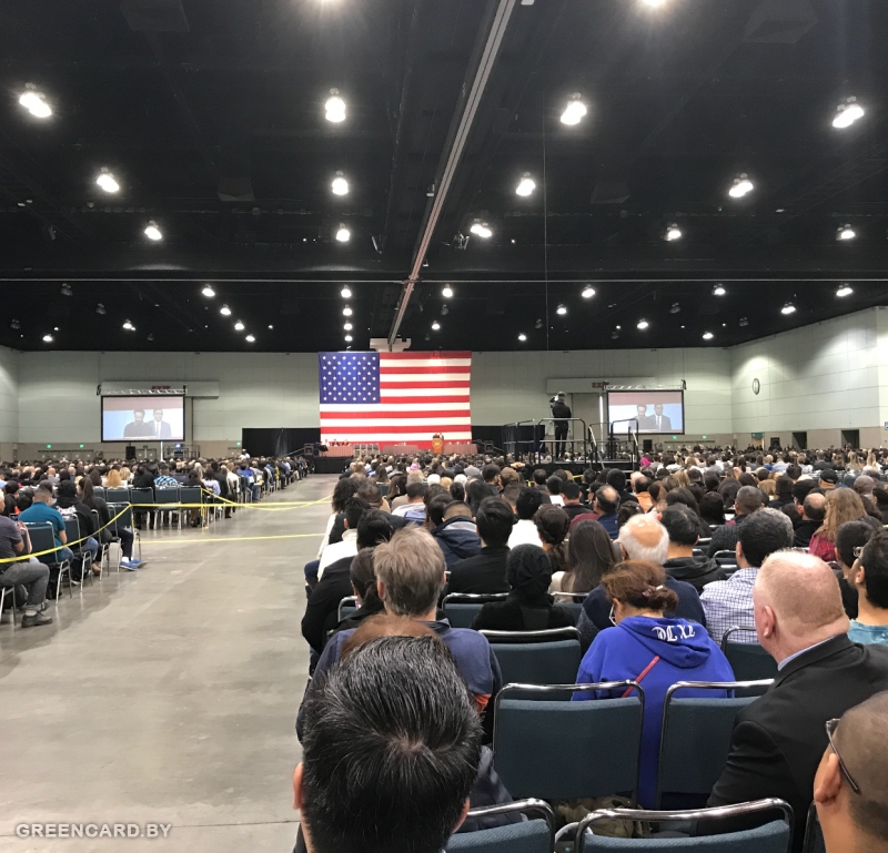 Церемония -это настоящее событие! Это настоящий праздник для новых апликантов! Большинство приходили с семьями и друзьями. Весь огромный Холл Тома Брэдли был заполнен! А это около 30 тыс мест! Из них, апликантов было около 5 тыс. (фото внизу)!Регистрация, присяга, получение сертификата и ты гражданин! Мы с Санычем попали в небольшое приключение, которое могло закончится переносом церемонии для нас! Но благо всё обошлось! Ленточка, которая отделяла апликантов от гостей, каким то образом, отделила и нас с Санычем! Мы оказались на стороне гостей! Когда разобрались, нам пришлось принимать присягу второй раз! Персонально! К нам пришёл главный судья Лос Анджелеса и зачитал клятву только для нас двоих! Я так перенервничала, что в конце забыла ответить на вопрос судьи :- ю ду? И он мне подсказывает:- ай ду! Я говорю -Ай ду! Следом повторяет Саныч-Ай ду!))))