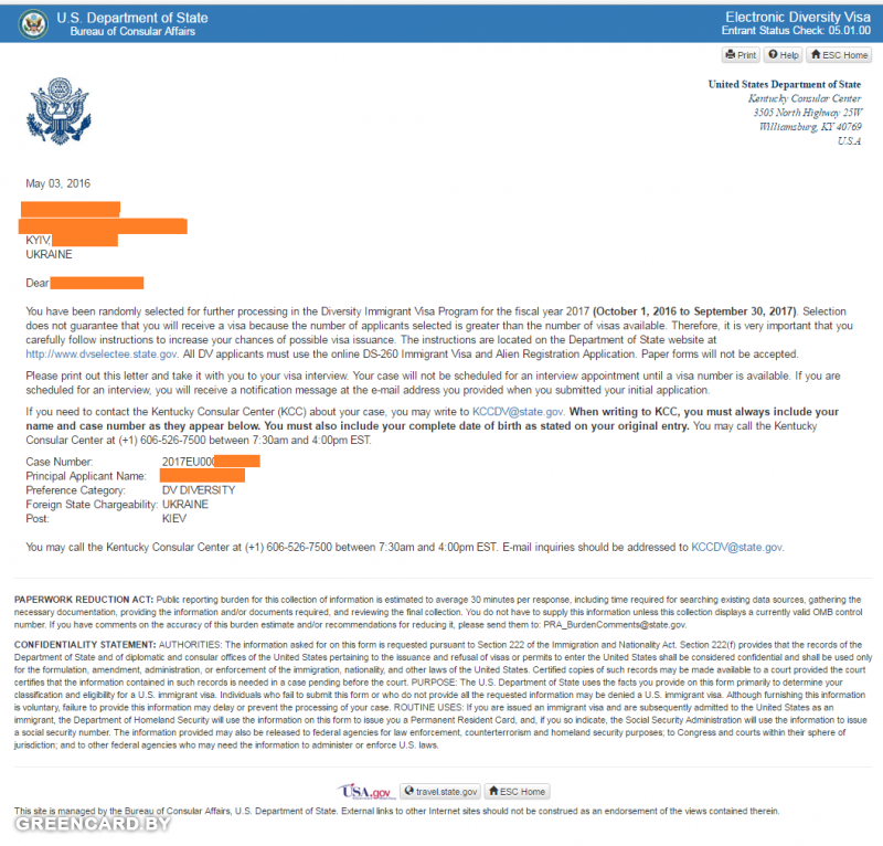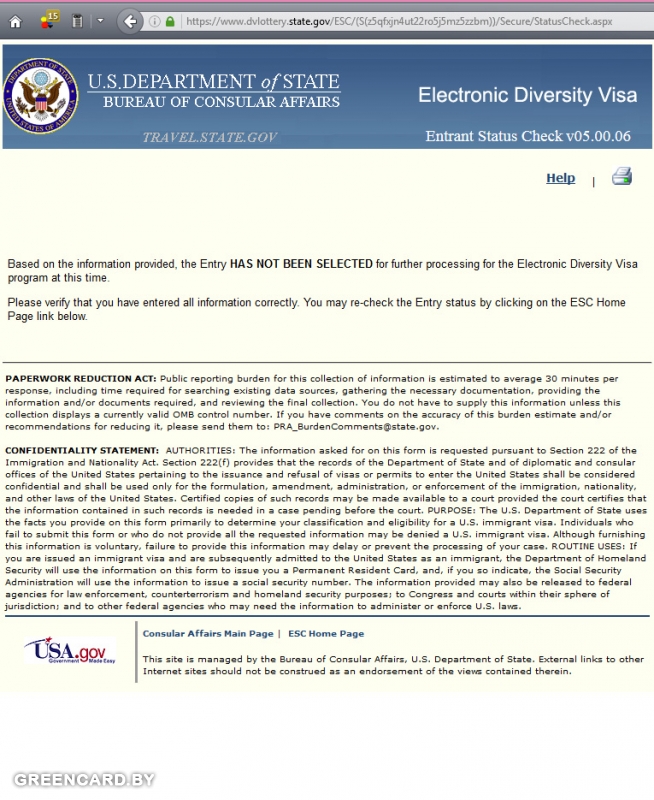 Проверить результат DV-2017 можно с 3 мая 2016 года на сайте госдепартамента http://www.dvlottery.state.gov/ESC/. Вы обязательно должны знать свой Confirmation Number. Если его по каким-то причинам нет, то вам в соседнюю тему. Вы должны будете ввести: Confirmation Number - проверочный номер, который присваивается заявке в момент её отправки Last/Family Name - фамилия Year of Birth - год рождения Как выглядит страница с результатом, смотрите ниже во вложенных файлах (образец прошлого года). Если кратко, то в случае выигрыша вы увидете длинное письмо, а в случае проигрыша - короткое с текстом "Based on the information provided, the Entry HAS NOT BEEN SELECTED for further processing for the Electronic Diversity Visa program at this time." Если у кого-то не получается открыть проверочную страничку на сайте госдепартамента, выдает ошибку, то загляните в эту тему, постараемся помочь. На форуме открыта новая ветка: Выигравшие DV-2017. Опросник для победителей. Приглашаем всех победителей принять участие в опросе! Сообщения, не относящиеся к обсуждению результатов, будут переноситься в оффтопик. Желающих поболтать на всевозможные темы прошу переместиться в Беседку.