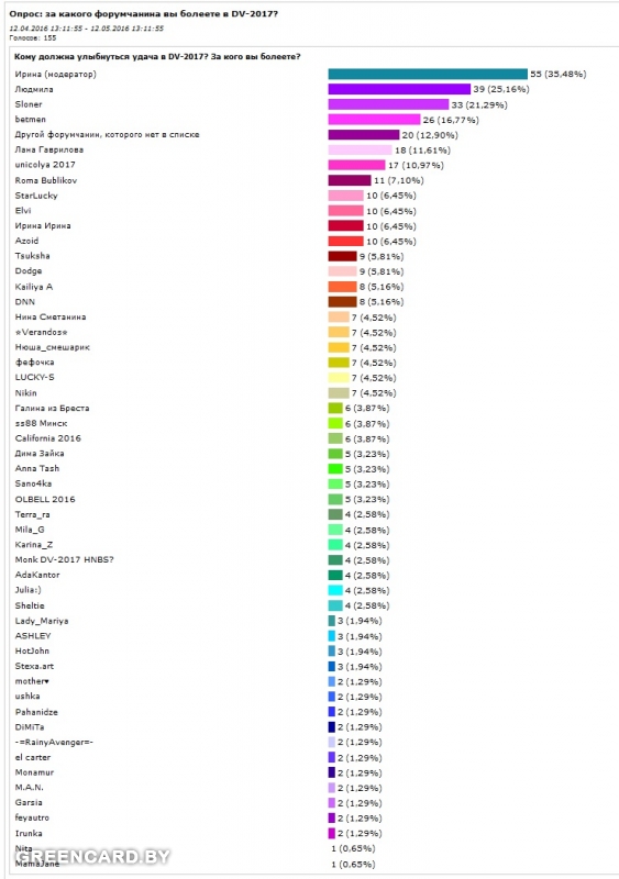 Если кому-то из этого списка улыбнулась удача, пожалуйста, напишите об этом в данной теме! *********************************** По просьбе форумчан стартует опрос: Кому должна улыбнуться удача в DV-2017? За кого вы болеете?