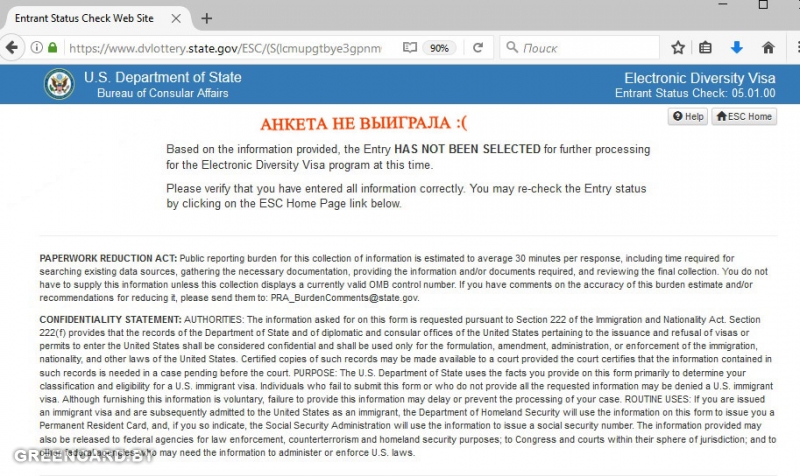 Как выглядит страница с результатом, смотрите ниже во вложенных файлах (образец DV-2017). Если кратко, то в случае выигрыша вы найдете длинное письмо, а в случае проигрыша - короткое с текстом "Based on the information provided, the Entry HAS NOT BEEN SELECTED for further processing for the Electronic Diversity Visa program at this time."